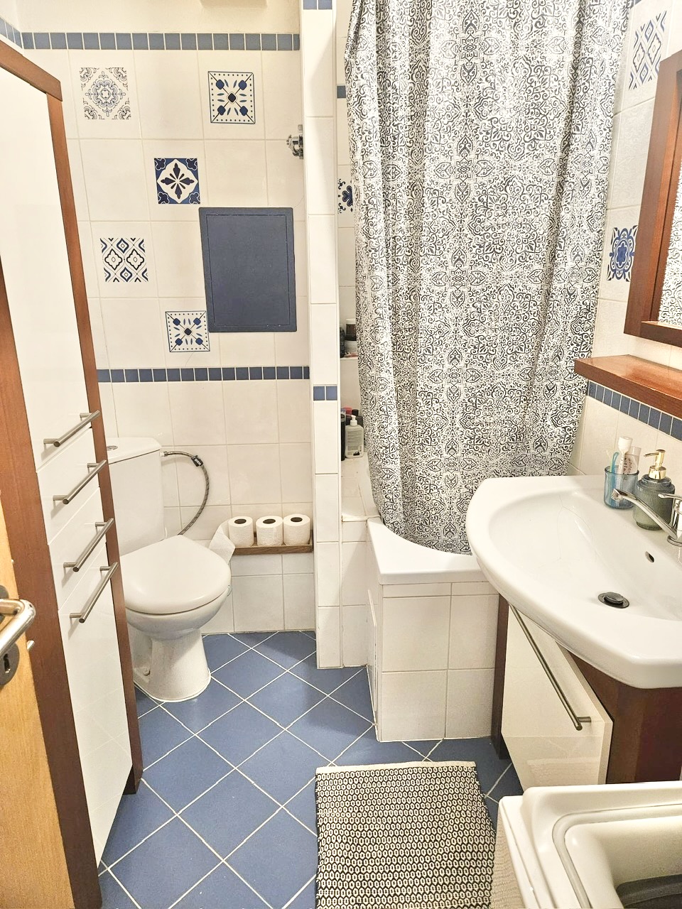 - kúpeľňa: kompaktná vaňa, umývadlo, toaleta, práčka, úložné priestory