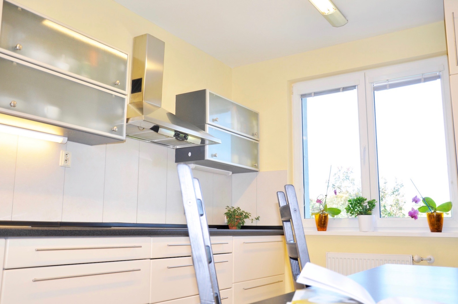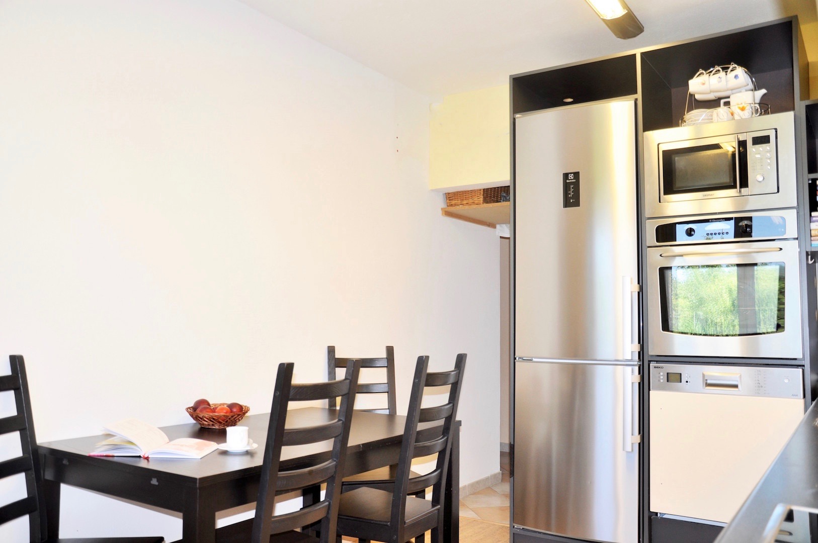- v kuchyni sa nachádza moderná kuchynská linka so zabudovanými spotrebičmi (chladnička, umývačka, rúra) a jedálenský stôl