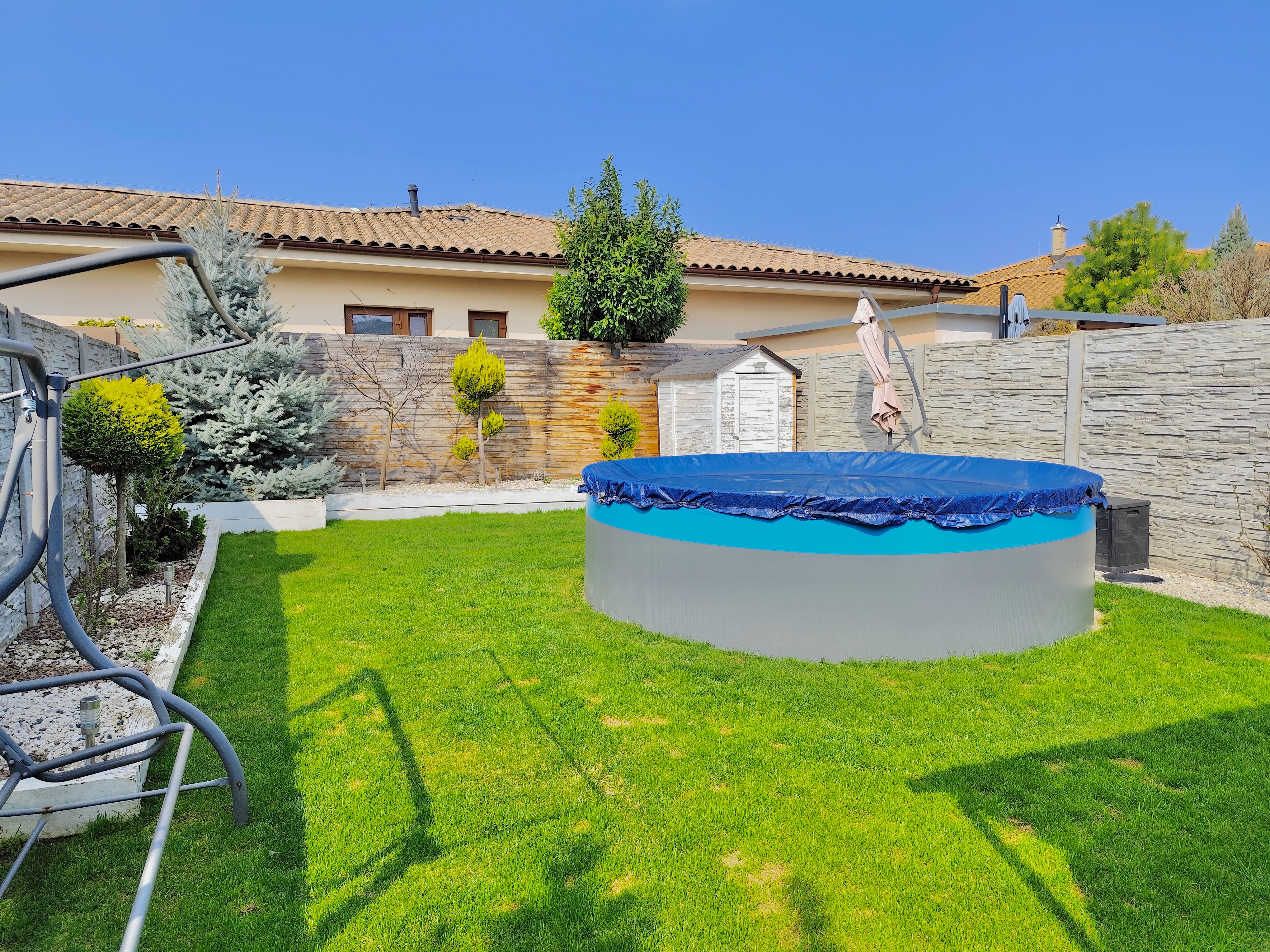 Aston Waldner Vám ponúka exkluzívne na predaj 4 izbový rodinný dom v tichej časti Malinova na Bazovej ulici. Dom je ideálny ak hľadáte príjemné bývanie s výhodami, ktoré rodinný dom ponúka, ale zároveň bez zbytočných starostí okolo pozemku. Je vhodný aj pre rodinu s malými deťmi, ktorá tu môže na krytej terase so sedením a barom prežiť bezstarostné leto s priateľmi pozorovaním detí v bazéne. Taktiež je ideálnou voľbou aj pre starší pár, vďaka nízkym nákladom bez nutnosti investícií a pokojnému bývaniu. Blízkosť Bratislavy je veľkou výhodou, taktiež si nemusíte robiť starosti s parkovaním. Prídite sa pozrieť, možno Vás práve táto ponuka osloví. Dom je kúpou voľný.